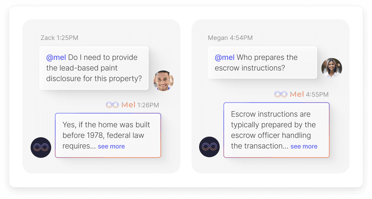 On-demand compliance support: When your agents have a question, instead of disrupting you, they can just ask Mel. From contract guidance to state-specific rules, agents get fast, accurate answers from within their workflow.